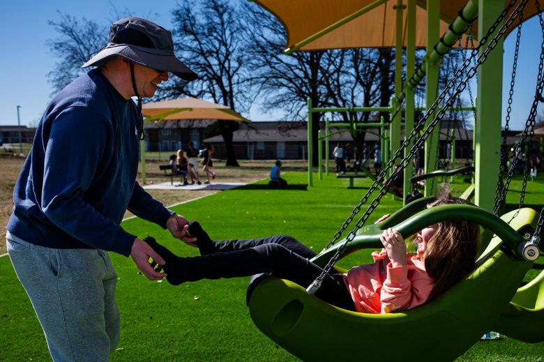 Inclusive parks, like Bales, feature wheelchair-accessible merry-go-rounds and bigger swings. There’s also a communication guide.